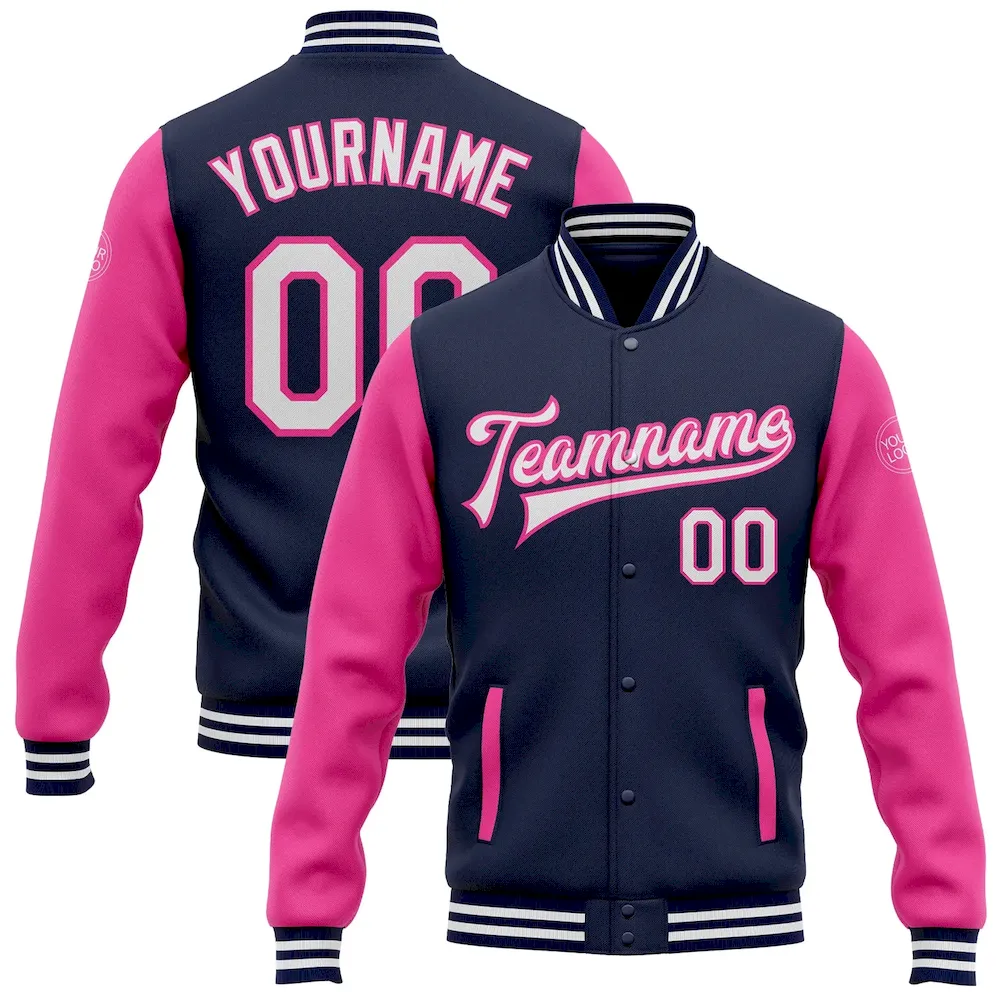 £38.99Custom Navy White-Pink Bomber Full-Snap Varsity Letterman Two Tone Jacket