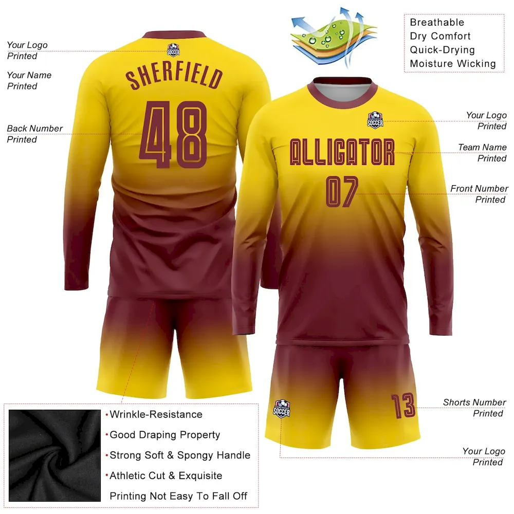 Custom Gold Burgundy Sublimation Long Sleeve Fade Fashion Soccer Uniform Jersey